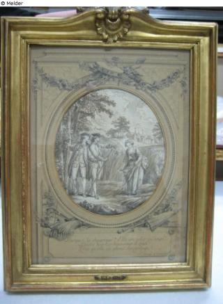 restituted Found-Object Report Pourquoy la chagriner? Elle est jolie et sage [...] (Vorlage für einen Illustrationsstich zur Komödie "Les Moissonneurs" von Charles Simon Favart) Artist / Creator Eisen, Charles Dominique Joseph Object type Drawing Material / TechniquePaper / drawn ; washed ; drawn (pen-and-ink drawing)Lost Art-ID568264