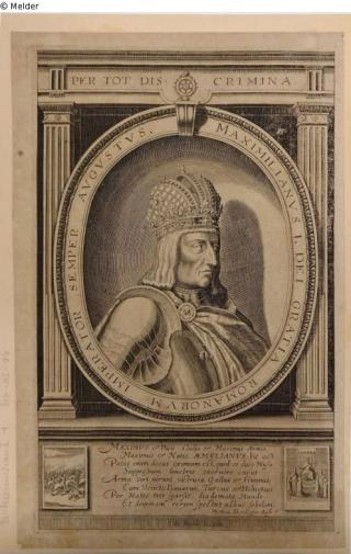 Found-Object Report Bust in written oval, Maximilian I (Per tot discrimina..) Artist / Creator Heyden, Jacob van der Object type Print Material / TechniquePaper / printed (copper engraving)Lost Art-ID593028