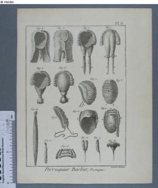 Found-Object Report Perruquier Barbier, Perruques; Pl. 8 from Diderot-D'Alembert Encyclopédie, ou dictionnaire raisonné des sciences, des arts et des métiers Artist / Creator Bénard, Robert (published by Denis Diderot and Jean-Baptiste le Rond d’Alembert) Object type Print Material / TechniquePaper / printed (copper engraving)Lost Art-ID622868