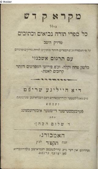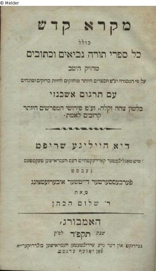 Found-Object Report Mikra kodesh kolal kol sifrei torah, nevi'im u-ketuvim im targum ashkenaz (Die Heilige Schrift einschließlich aller Bücher der Torah, der Propheten und Schriften mit deutscher Übersetzung) Printer Josef Ernst Object type Book Lost Art-ID304024