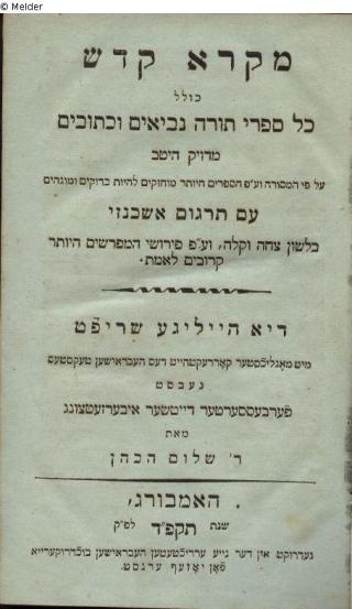 Found-Object Report Mikra kodesh kolal kol sifrei torah, nevi'im u-ketuvim im targum ashkenaz (Die Heilige Schrift einschließlich aller Bücher der Torah, der Propheten und Schriften mit deutscher Übersetzung) Printer Josef Ernst Object type Book Lost Art-ID304023