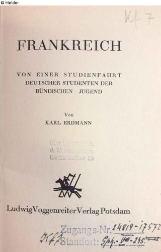 Found-Object Report Frankreich. Von einer Studienfahrt deutscher Studenten der Bündischen Jugend Author Erdmann, Karl Publisher Voggenreiter (Ludwig) Object type Book Lost Art-ID623792