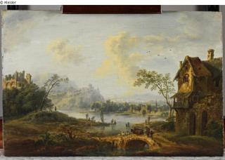 Found-Object Report River landscape with bridge an ruin Artist / Creator Unknown Object type Painting Material / TechniqueOil ; Panel (Oak) / paintedLost Art-ID422141
